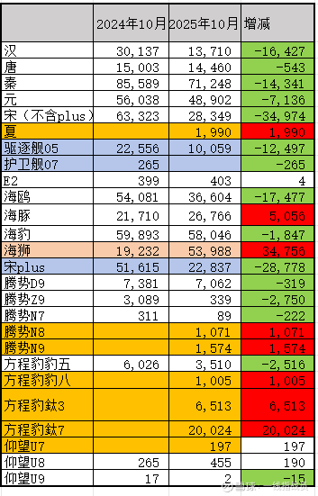 一,老车型的销量普遍下滑,唯一有增长的是海豚。这还是海外销量同比增长5.2万辆的情况下。国内老车型的销量下滑很明显。