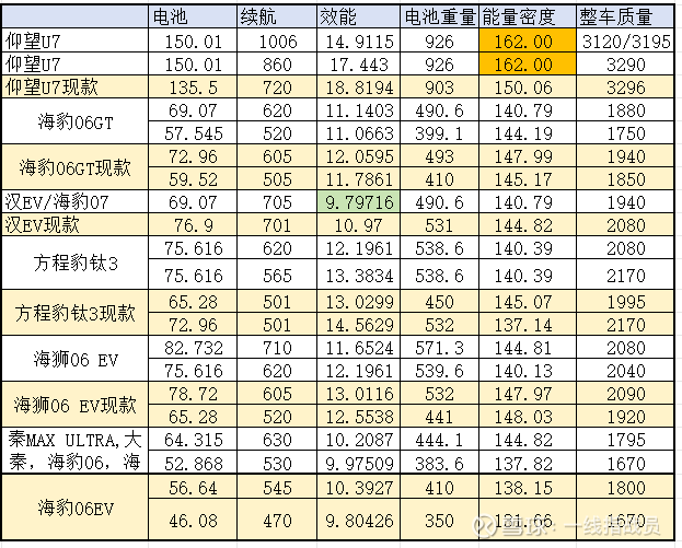 1,仰望续航超1000公里的车型,电池能量密度提升到了162(Wh/kg),现款车型大概在150左右。增加15度电,整车质量反而降低6公斤。