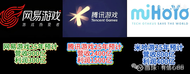 腾讯去年的营收和利润是预计2400亿和1500亿,网易营收和利润预计是900亿和300亿,米哈游的营收和利润预计是800亿和400亿。而这三家都没在A股上市。再之后,排名第四的就是世纪华通了