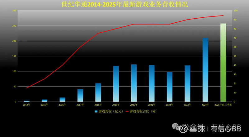 这是我做的游戏业务占华通总营收的比重图,柱子代表营收金额,红色曲线代表游戏占总营收比重,时间从左到右。可以看到,游戏收入在2014年只有3亿多一点,只占总营收的15%,之后一路上扬,到2024年游戏营收已经有210亿,占到了总营收的93%。绿色柱子是2025最新的三季度,三个季度的游戏营收已经有257亿,比24年全年都多,占总营收的95%了。汽车业务已经不用关注了,游戏成了华通绝对核心业务。