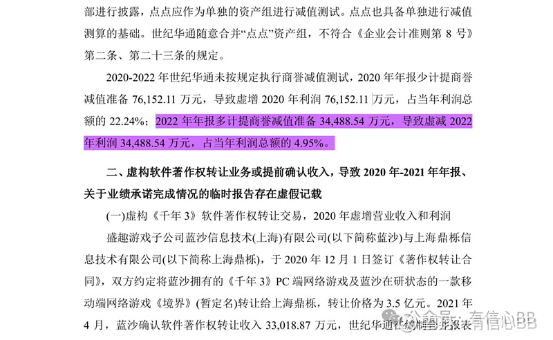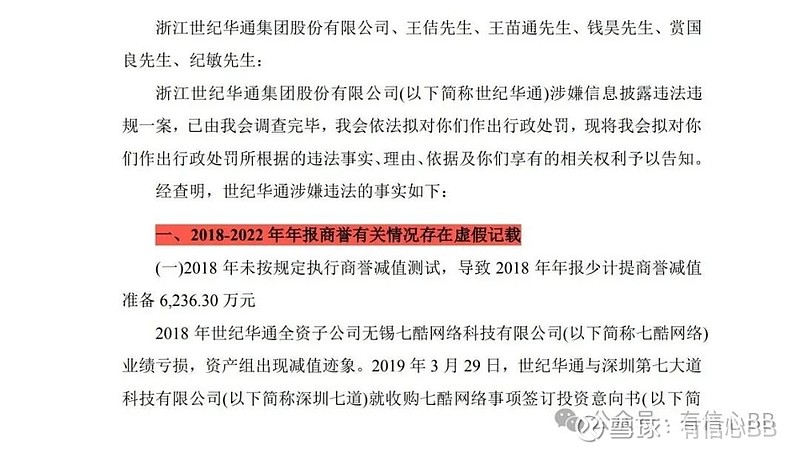 2024年4月1号,证监会对世纪华通发布了立案告知书,决定对华通立案。当天,华通也发布了关于收到《行政处罚事先告知书》的公告。公告里证监会经查明,世纪华通涉嫌违法的事实如下,标红的这句:2018-2022年年报商誉有关情况存在虚假记载。之后两三页的内容都是在围绕世纪华通是怎么在商誉这个问题上在财报里弄虚作假的。