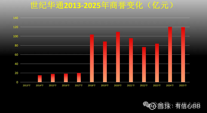 这是我做的2013年到2025年世纪华通商誉变化图,数额单位是亿元,时间从左到右。可以看到,2013年他还没开始收购游戏厂商的时候商誉还是0。之后开始收购,商誉在接近20亿的水平。2018年收购点点互动,商誉一下子就到了100亿的水平,说明收购点点互动的溢价非常高,但好在点点互动也争气,这几年给挣了回来。2019年虽然花300亿收购盛趣游戏,但可以看到,溢价不高,商誉反而有所下降。
