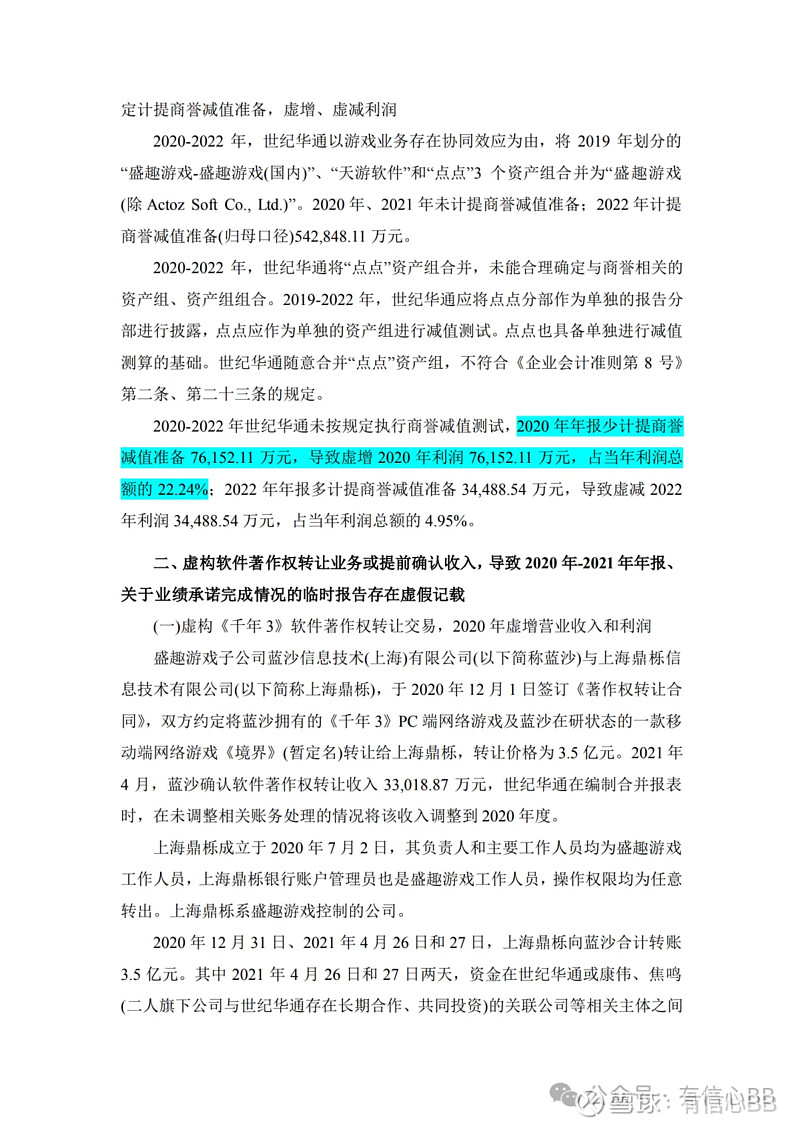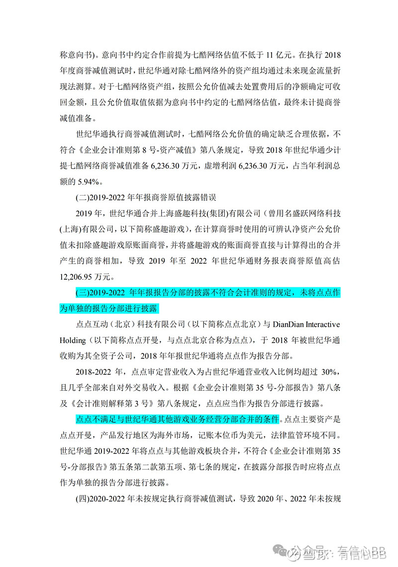 这几年也是因为收购了点点互动,点点互动业绩好,其他游戏业绩不好,华通没有按规定把点点互动单独披露,一起吃大锅饭,掩了盖其他游戏的亏损。这一操作让公司当年少计提减值7.62 亿元,虚增利润比例22%。