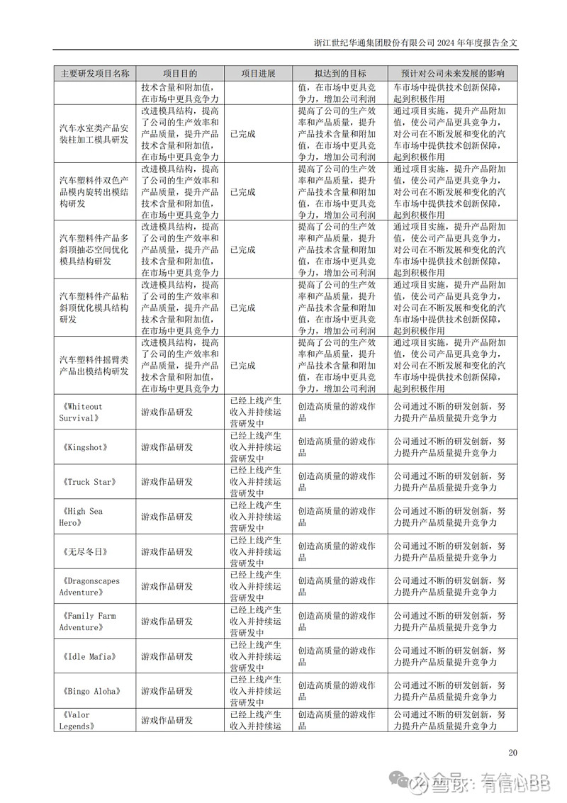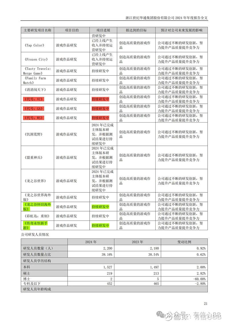 而且在24年年报第20和21页的研发投入情况表里,世纪华通有25款已经研发完成和仍在研发的游戏,其中标红的是点点互动正在研发的,标绿的是盛趣正在研发的,其实还有几款是在这上面标注的仍在研发中,但由于这是去年的年报,时间已经滞后一年了,有些游戏现在已经上市了,没上市的就是我标出来的这些。而且又过了一年,等最新的25年年报出来,肯定又会有一些新游戏加入了研发队伍。