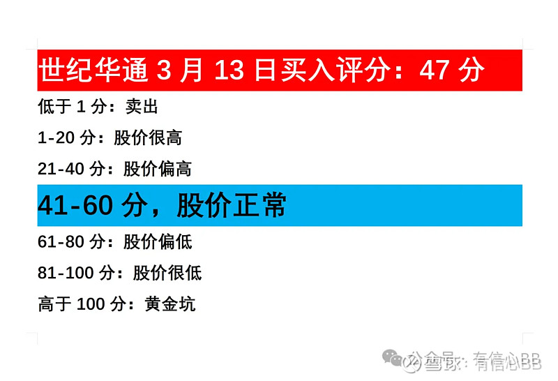 我给世纪华通股票3月13日的买入评分是47分,股价在合理区间,这是基于公司评星18.1星宽容版的评分;
