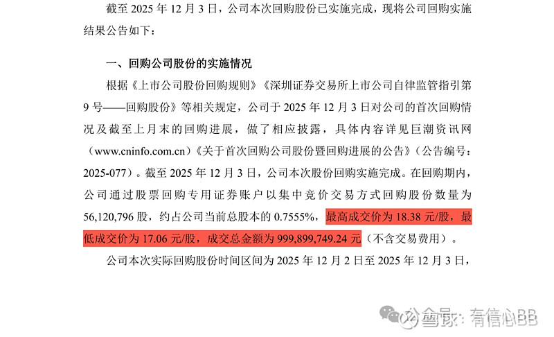 而且说到做到,五天后的12月5号,就以平均18块每股的价格,以这次回购计划的上限10亿完成了回购,并在之后几天注销掉了一部分股票。