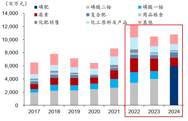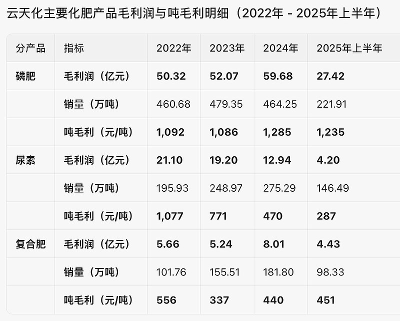 如果2026年要保持过去几年差不多的收益,主营业务的毛利要要保持在100亿以上,这就得靠云天化的基本盘化肥业务了。过去几年化肥业务保持了80亿元的毛利,基本由磷肥,尿素和复合肥业务贡献,其中磷肥贡献最大。