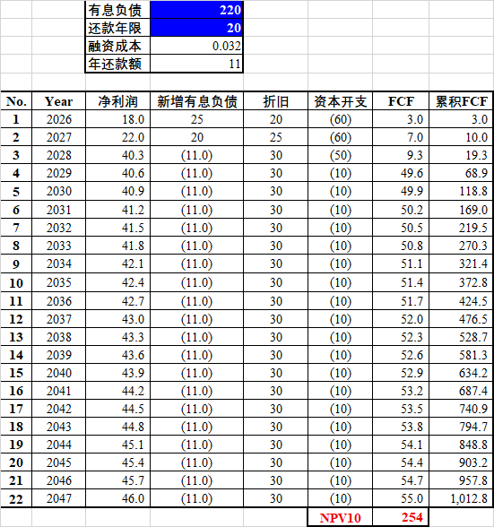 下表是中性情景2028年后净利润为40亿的估值,10%折现率下的NPV10=254亿。这里需要说明的是: