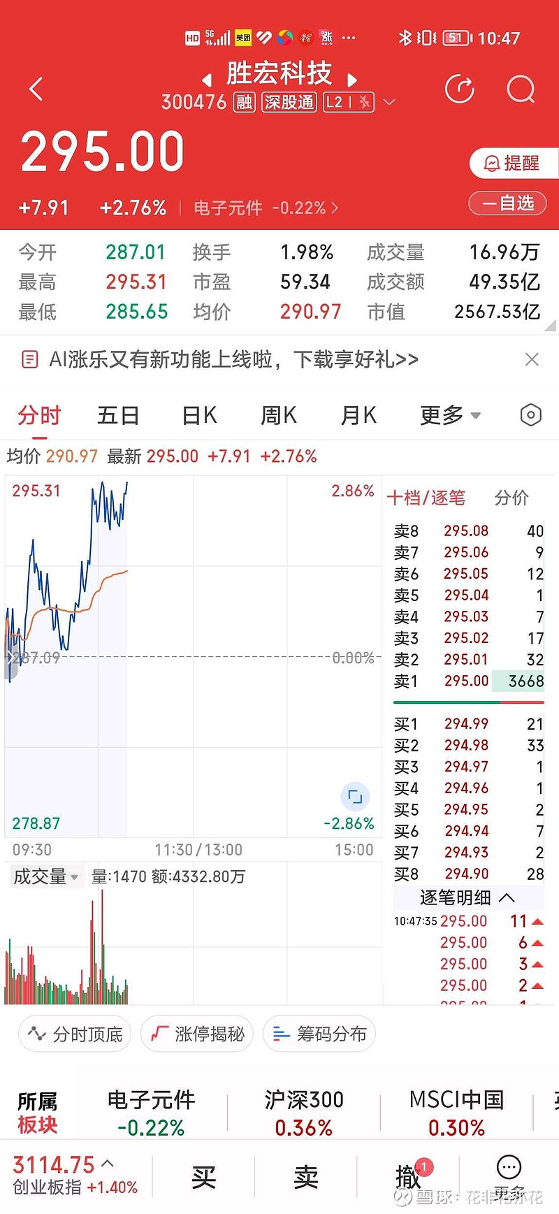 476受外围美股影响,低开下杀,于均价293.70元清仓,收盘于290.30元。