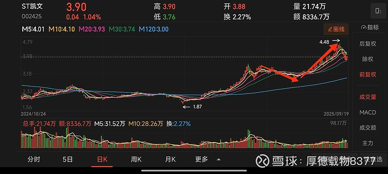 $ST凯文(SZ002425)$凯文从1.87元上涨以来,经历了三次比较大调整:第一次:6月17日到6月23日,价格从3.61元跌到2.93元,调整幅度18.8%,笫二次:6月27日到7月31日,价格从3.53元跌到2.97元,调整幅度15.9%第三次:9月12日到9月19日,价格从4.48元跌到3.76元,调整幅度16%。9月19日大概率是本轮调整的低点,所以昨天出手加仓!$ST板块(BK0400)$