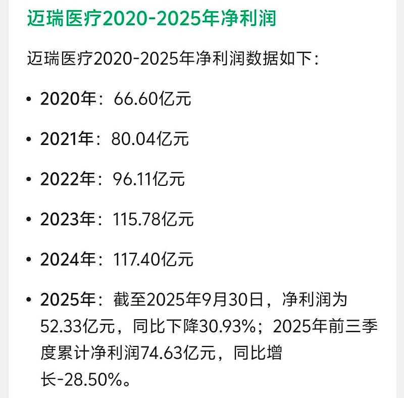 $迈瑞医疗(SZ300760)$即使2025年只有92亿净利润,也比2020年增长了38.14%,这已经消化了多少估值,更何况还有2023-2024年净利润支撑,以及2026-2030预期向好。作为医疗器械企业,迈瑞已经跨过了危险期的规模或体量,在中国和世界老龄化、龙头站位、国际化等趋势下,迈瑞只会越来越强。结论:迈瑞目前已低估很多。