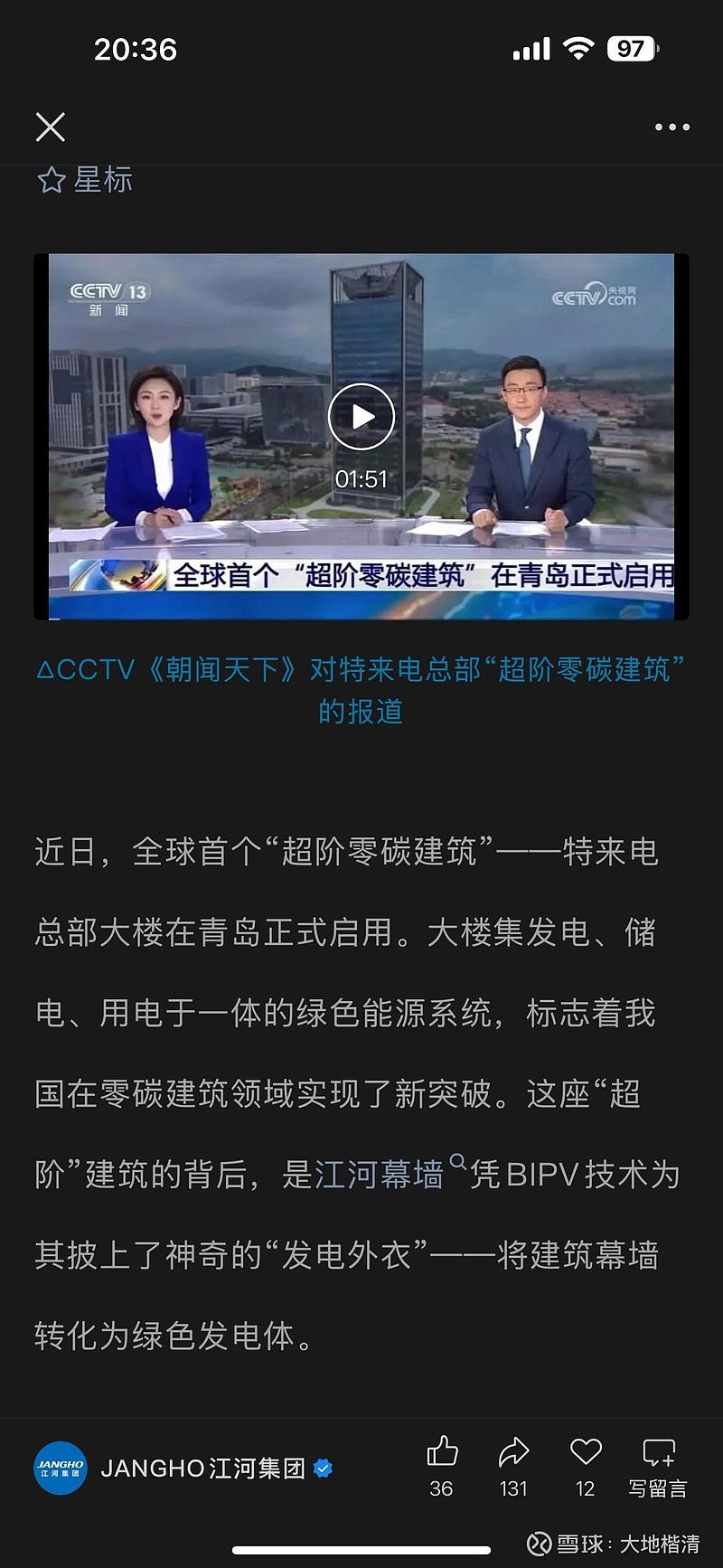 近日,全球首个零碳建筑在青岛投入使用。江河集团的光伏幕墙迎来大规模应用拐点。