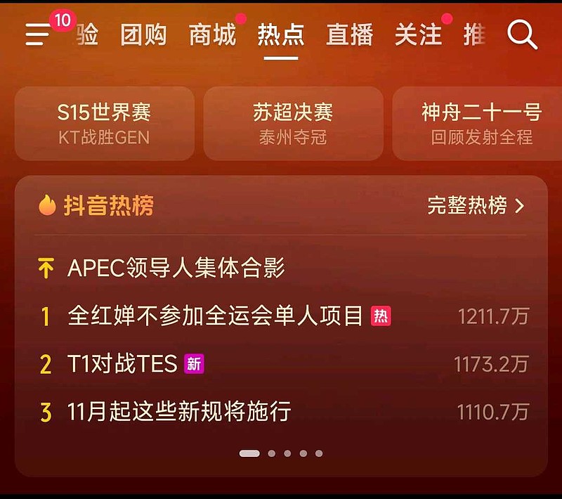 全运会抖音热榜第一来了。今天粤港澳三地火炬传递,全网发酵。
