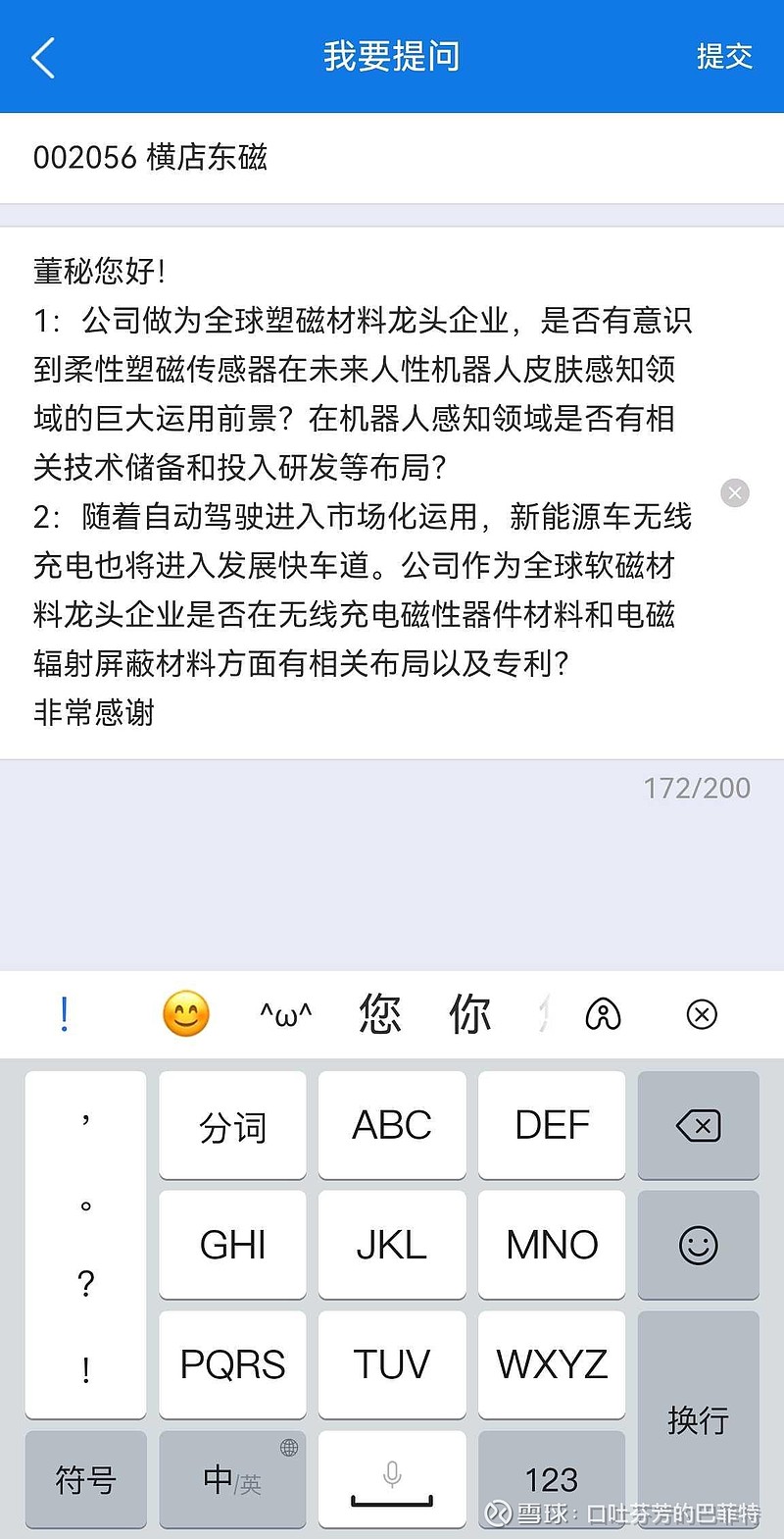 $横店东磁(SZ002056)$$万科A(SZ000002)$ $贵州茅台(SH600519)$ 了解我的人都知道,从来到雪球那天起,我就旗帜鲜明的开始踩万科和茅台以及力挺东磁。当然就目前形势看来万科踩的效果比较显著,已经呈现出一踩一个不吭声的状态。而茅台因为在房子后两三年才开始形成明显量价同时下跌导致韭友们苏醒时间远超预期,所以目前还未被完全踩扁,对此我深表遗憾。同时我也深知投资之路如履薄冰的道理,凌晨怀着无比敬畏不耻下问的精神战战兢兢向东磁董秘提出两个百思不得其解的问题,也向场内围观韭友求助最终答案,望不吝赐教一二,跪谢!![]()
