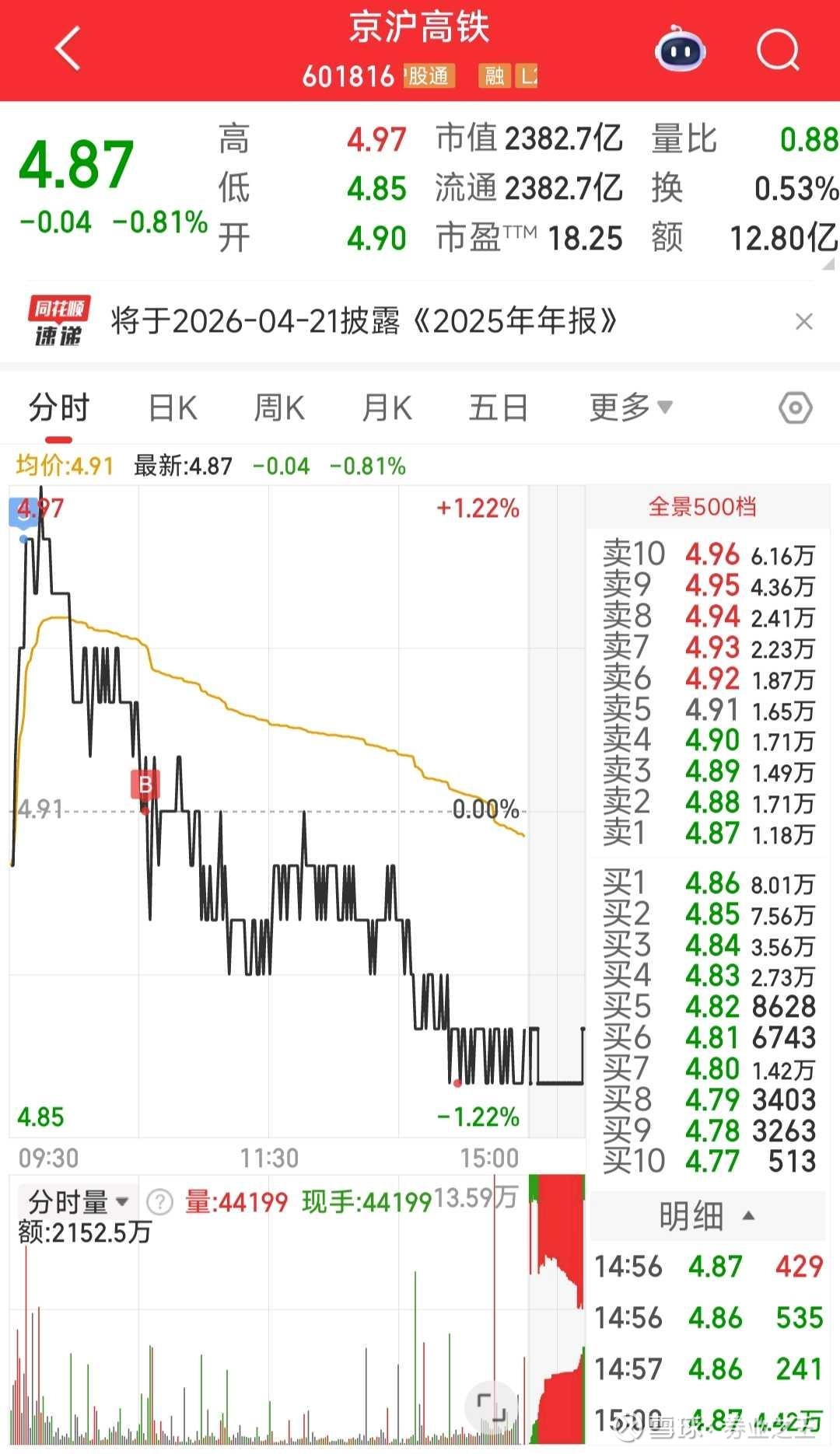 京沪高铁今日卖出成交。