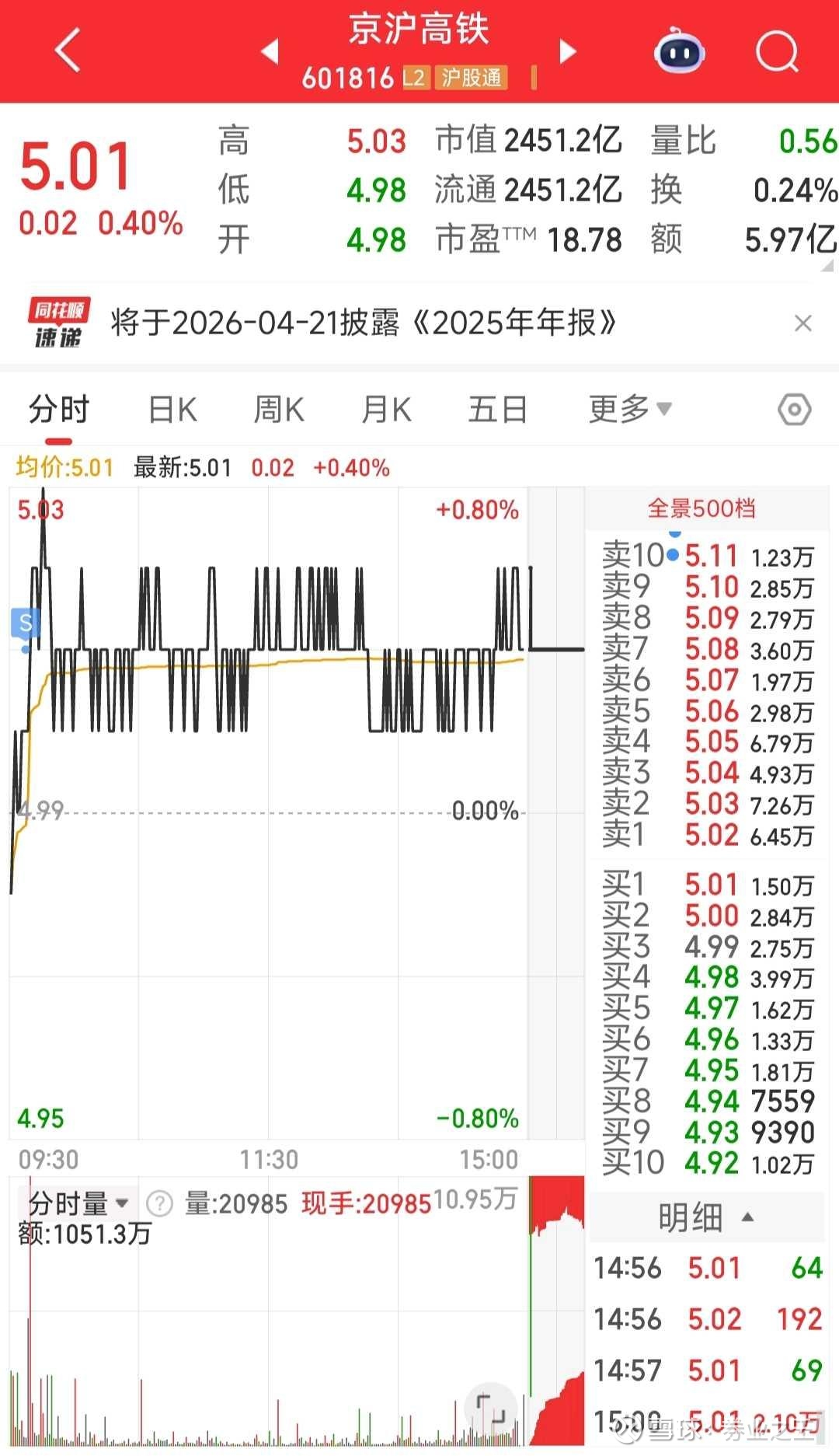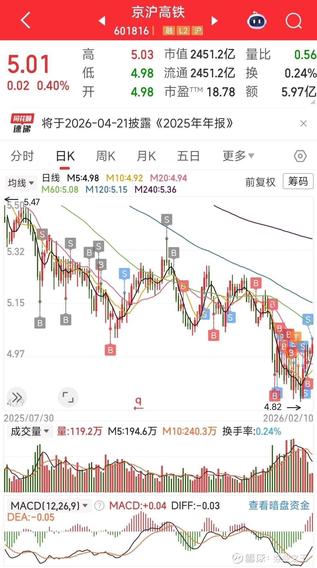 缩量反弹,万手哥都少见了,现在已到压力位,接着二次探底就是底背离了。春节是利好高铁股的,只是已经饱和了又如何再好呢?计划不变,今年没机会我就等明年。京沪高铁今日卖出成交。价格;5.01元。数量;20200股。接下来是4.96的买单,5.11的卖单。仓位;18.0%成本;4.718