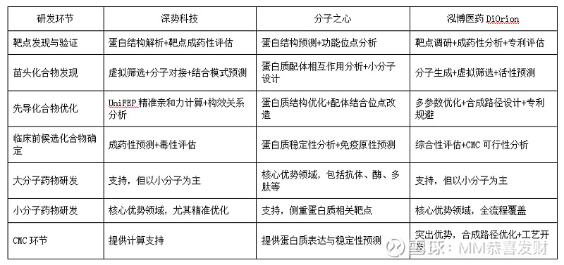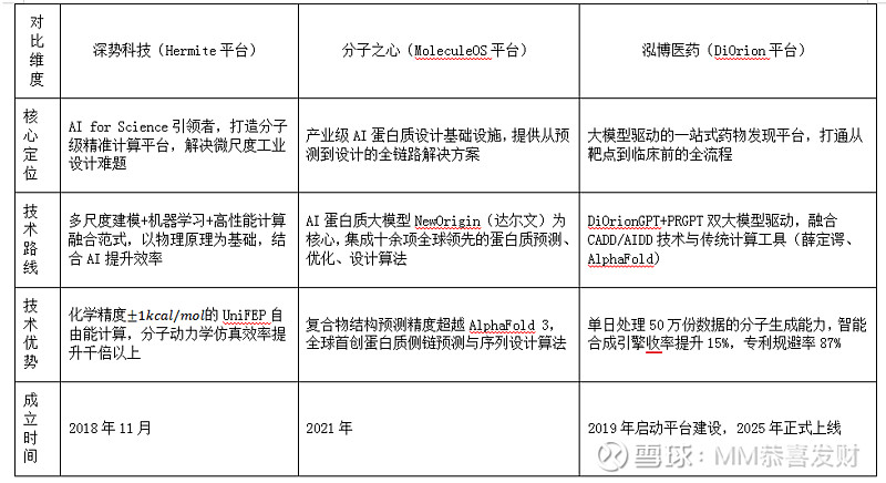 深势科技:以AI for Science+物理建模+高性能计算为核心,在分子模拟与自由能计算领域精度与效率领先,适合小分子药物的精准优化场景。 分子之心:以AI蛋白质设计大模型NewOrigin为底座,在蛋白质结构预测与复合物设计上表现突出,擅长大分子药物(抗体/酶)与蛋白质相关小分子研发。 泓博医药DiOrion:大模型驱动+模块化全流程,突出分子生成、合成路径优化与专利规避,适合FIC小分子新药快速发现与CMC一体化研发,且与深势有合作协同。 下面从多维度展开对比,信息均来自公司官网、权威媒体报道及券商研报,力求客观可追溯。