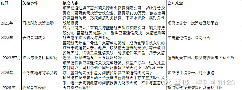 成立时间:2023 年 公司名称:广东硕贝德蓝箭航天科技有限公司 股权占比:硕贝德 51%、蓝箭航天 49% 核心业务:卫星通信天线、火箭遥测系统、航天射频组件的研发与产业化 权威来源:工商登记信息、东方财富网财富号、雪球行业分析