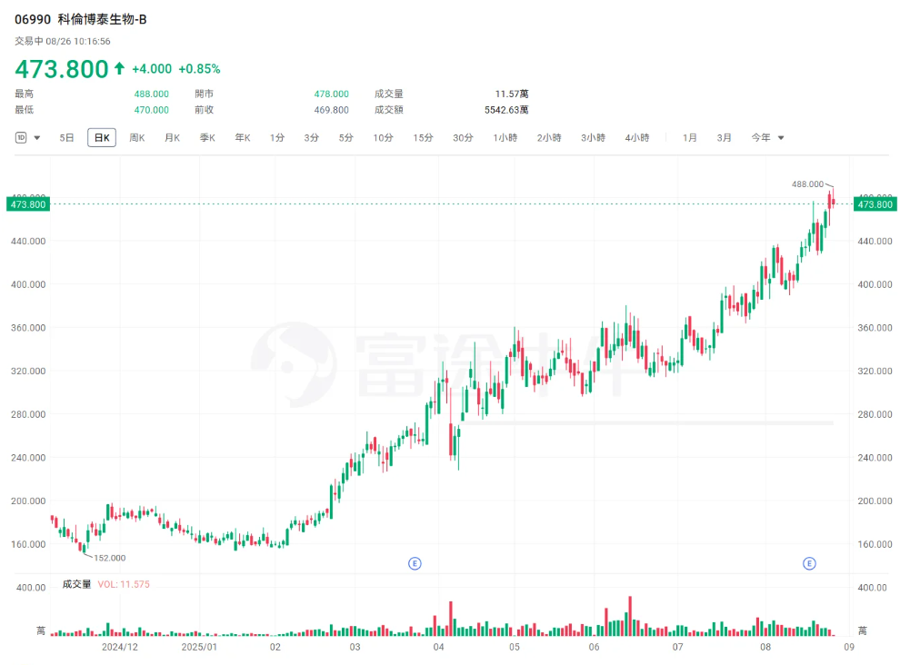 科伦博泰生物-B (06990.HK):6月以来累计大涨46%。8月下旬,招银国际发布研报称,对科伦博泰生物-B(06990.HK)SKB264的全球发展保持信心,将目标价由299.93港元上调至498.55港元,此按现金流折现率作估值,维持“买入”评级。科伦博泰生物上半年收入9.5亿元人民币,期内产品销售额达3.1亿元人民币,当中SKB264贡献3.02亿元,相当于该行全年预测的34%。SKB264早前获批用于治疗后线三阴性乳腺癌(TNBC)和EGFR突变非小细胞肺癌(NSCLC),目前正处于加速增长的初期阶段。管理层维持SKB264全年销售额8至10亿元的目标。该行预期SKB264两个已获批适应症将自明年初起纳入国家医保目录。