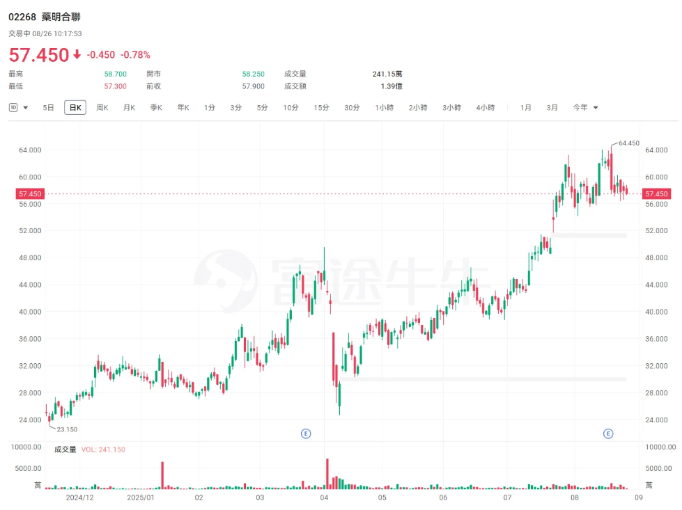 药明合联 (02268.HK):6月以来累计大涨逾44%。8月下旬,里昂发布研报称,对药明合联(02268)持有长期正面看法,重申“跑赢大市”评级,目标价从47.3港元上调至70.7港元,将2025至2027年收入及净利润预测上调7%至8%及13%至17%,目前预测2025至2027年收入将分别增长45%、31%及27%。