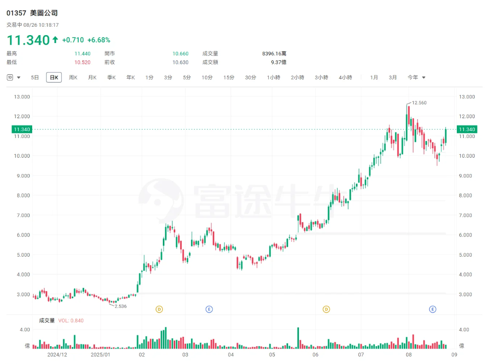 $美图公司(01357)$ :6月以来累计大涨逾61%。近日,美图公司(01357.HK)发布截至2025年6月30日止六个月中期业绩,收入18.21亿元(人民币,下同),同比增加12.34%;毛利13.4亿元,同比增加27.26%;股东应占溢利3.97亿元,同比增加30.84%;每股基本盈利0.09元;拟派发中期股息每股普通股0.045港元。公告称,收入增幅主要来自以订阅为主的影像与设计产品业务实现快速收入增长,而该增长则归因于截至2025年6月30日止六个月内付费订阅用户数的提升。