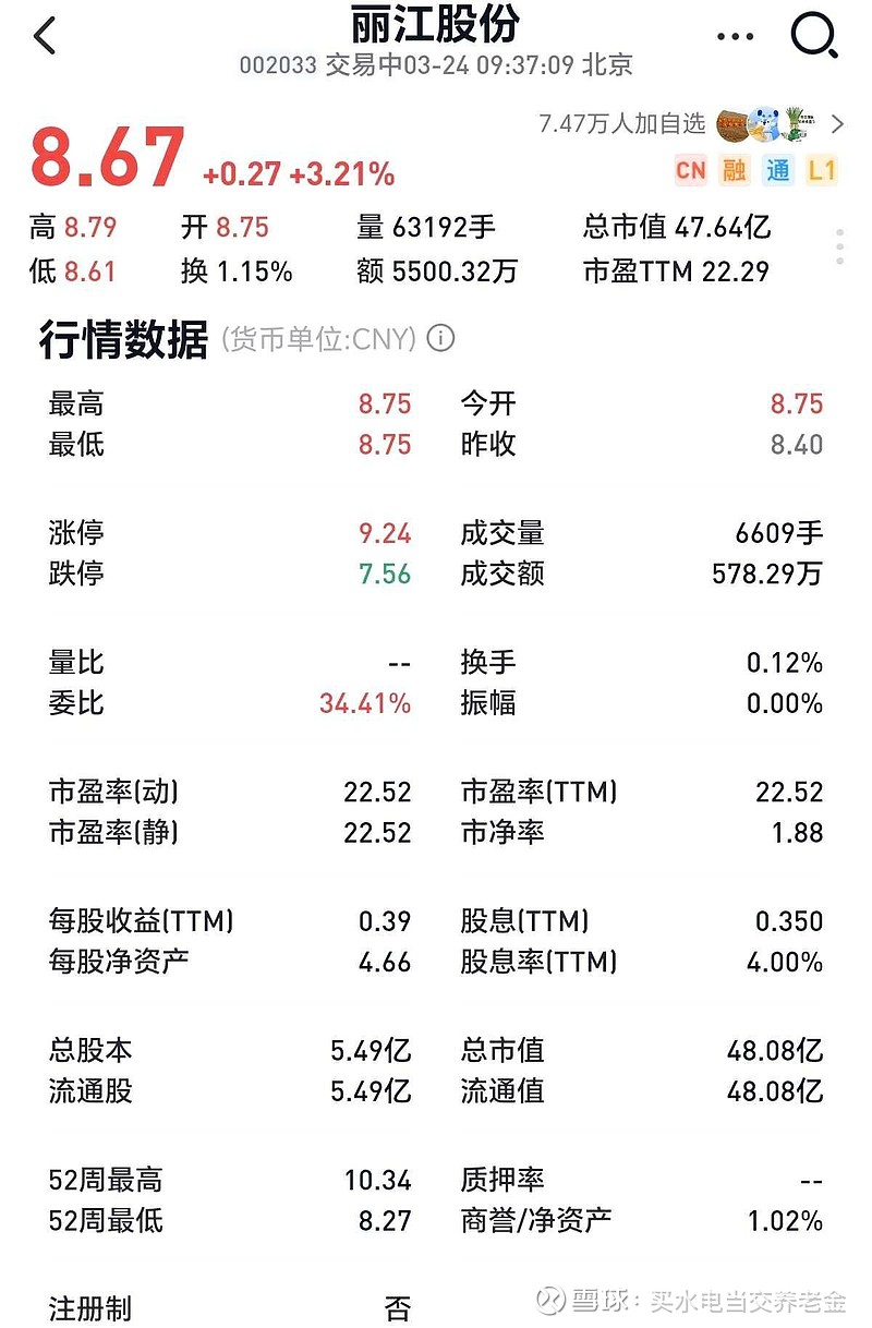 综上所述, 丽江股份每年实际赚的现金就是 分红的1.92亿+资产负债表现金增加额(8.91-8.08)=0.8346亿,+牦牛坪索道改建所投资的0.6亿。合计1.92+0.83+0.6=3.35亿元。 加上其他的固定资产支出,这就和现金流量表的3.88亿现金流入对上了。所以丽江股份的真实净利润是3.35亿元,真实pe就是46/3.35=13.7倍PE。这也就是今天大跌我加仓丽江股份的原因。作为下游业绩保底,上还可以蹭蹭牛市尾巴的稳定分红小盘红利股,每年再做上几个波段,完全可以轻松达到15%以上的复合收益,美哉美哉!$丽江股份(SZ002033)$ @今日话题 @小秘书 @雪球创作者中心