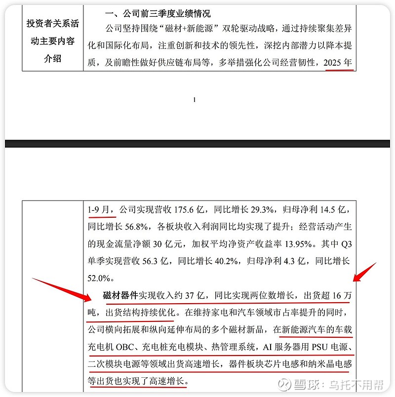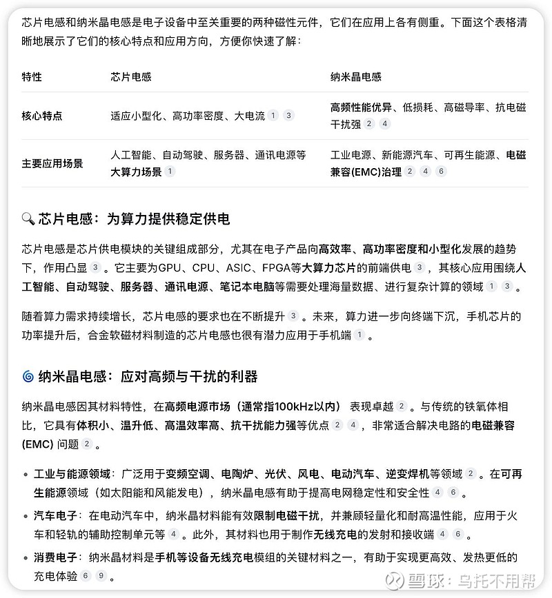 先看用词;前3季度对比半年报,磁材器件出货持续优化。在新能源汽车和AI服务器市场中非常明确的列举出了对应的应用场景;而且特别指出芯片电感和纳米晶电感实现了高速增长。这是在半年报没有提及的。大家可以看下这两样的应用场景。