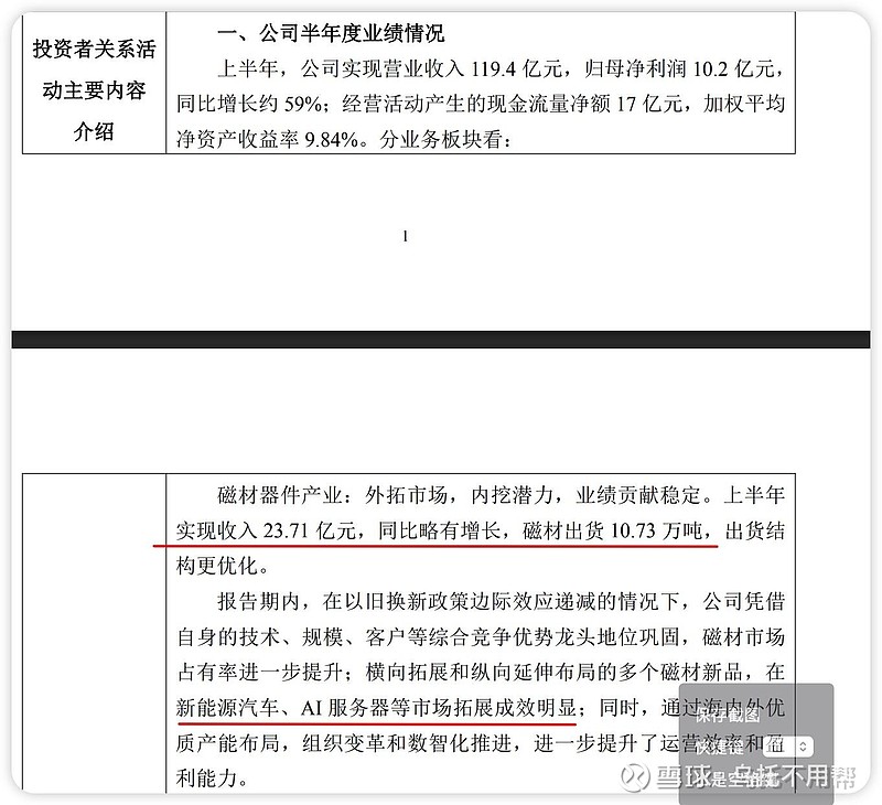 8月23号:上半年实现收入 23.71 亿元,同比略有增长,磁材出货10.73 万吨,出货结构更优化。在新能源汽车、AI 服务器等市场拓展成效明显。