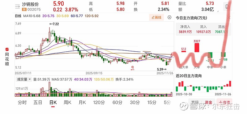 以我对沙钢股份的了解,后续走势大概率是这样子,在上下波动中完成公告,然后再拉升…猜错了,别找我,因为我就是瞎猜的,错了是常态;猜对了,纯运气,因为也是瞎猜的。如果我是做短线的,我会等几天回落道前面差不多低位,加仓。然后在6块左右减掉;然后再等到回落到前低左右加仓,然后继续……