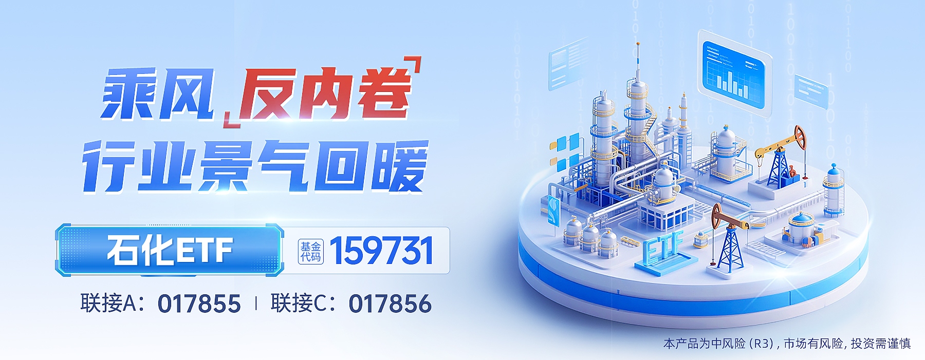 石化ETF(159731)及其联接基金(017855/017856)紧密跟踪中证石化产业指数,按照申万二级行业来看,中证石化产业指数前三大行业分别为炼化及贸易(27.12%)、化学制品(23.87%)和农化制品(19.75%),前十大权重股分别为万华化学、中国石油、中国石化、盐湖股份、中国海油、巨化股份、藏格矿业、华鲁恒升、宝丰能源和恒力石化,前十大权重股合计占比55.63%。有望充分受益于反内卷、调结构和淘汰落后产能等政策。$万华化学(SH600309)$ $中国石油(SH601857)$