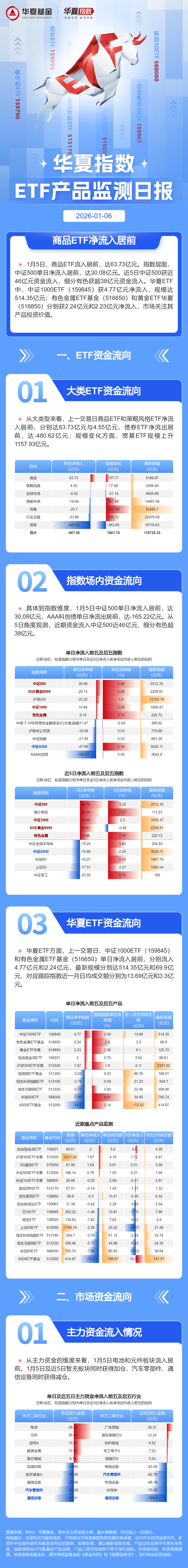 1月5日,从大类型来看,上一交易日商品ETF与策略风格ETF净流入居前,分别达63.73亿元与4.55亿元,债券ETF净流出居前,达-480.62亿元;规模变化方面,宽基ETF规模上升1157.93亿元。