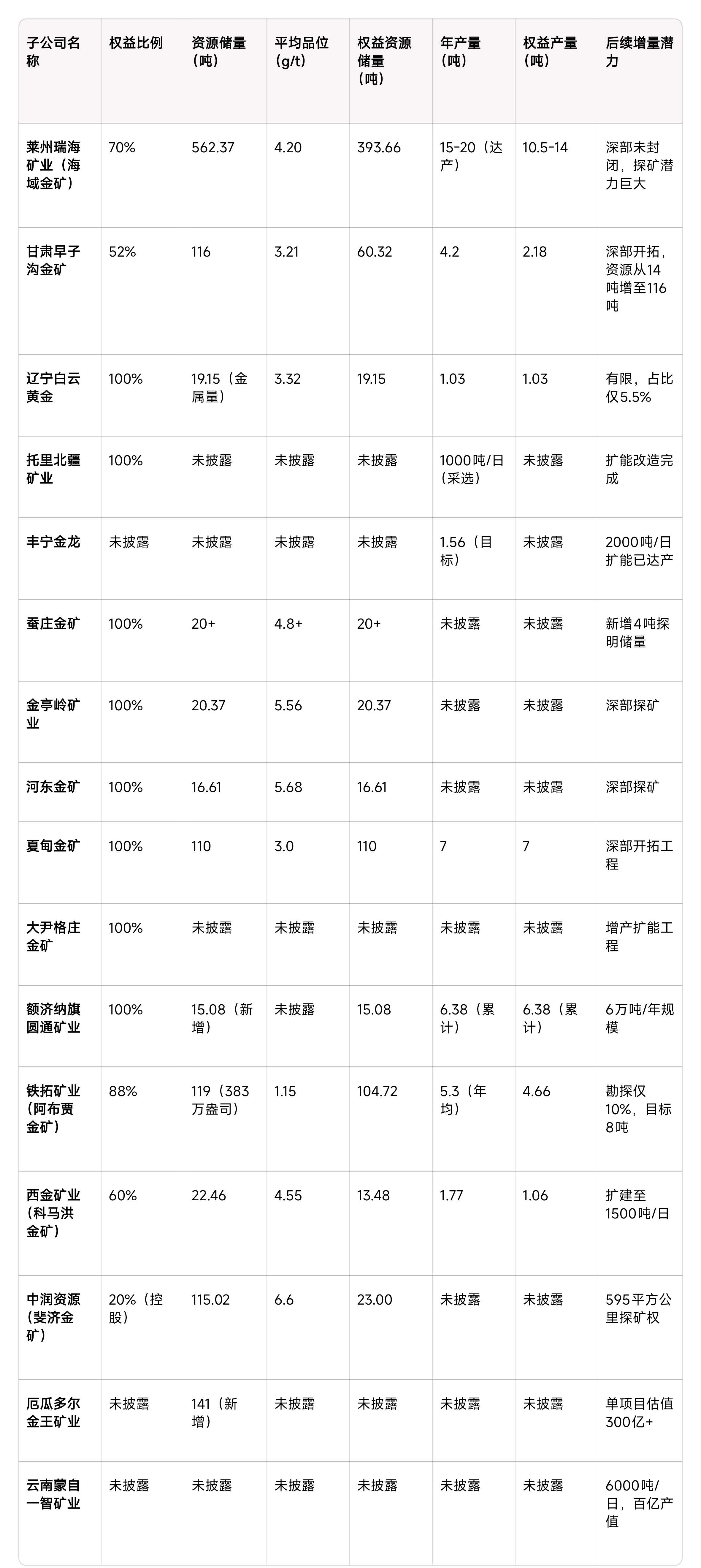 根据收集到的信息,以下是招金矿业主要子公司的权益比例、资源储量和产量汇总表: