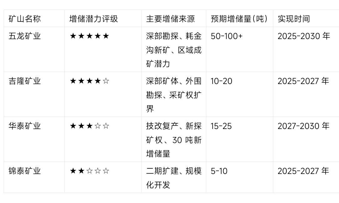 增储空间巨大且前景明确:四大矿山均具有不同程度的增储潜力,其中五龙矿业增储潜力最大,预测资源量超过1000吨;吉隆矿业通过深部和外围勘探有望新增10-20吨;华泰矿业技改后将释放26.71吨资源量并新增30吨预可研储量;锦泰矿业通过规模化开发实现资源价值最大化。