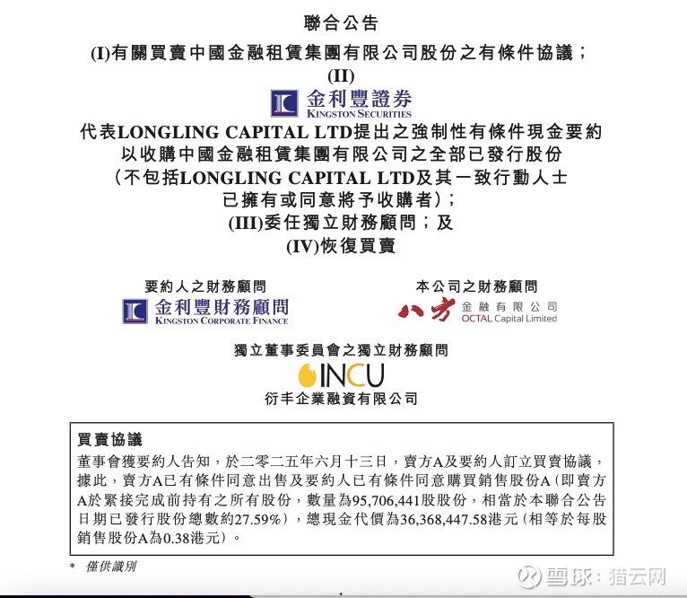 6月24日晚,香港上市公司中国金融租赁集团有限公司发布公告,原股东林树松及首都创投已向独立第三方Longling Capital(要约人)转让合计1.21亿股股份,占公司总股本约34.96%,总代价为4608万港元。