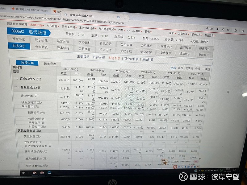 通过百分比报表演算,我发现惠天热电营业总收入与营业成本之间已经非常接近了。今年一季度营业成本甚至低于营业收入3.14个百分点,也就是说刨去期间费用,惠天有主业盈利的可能了。