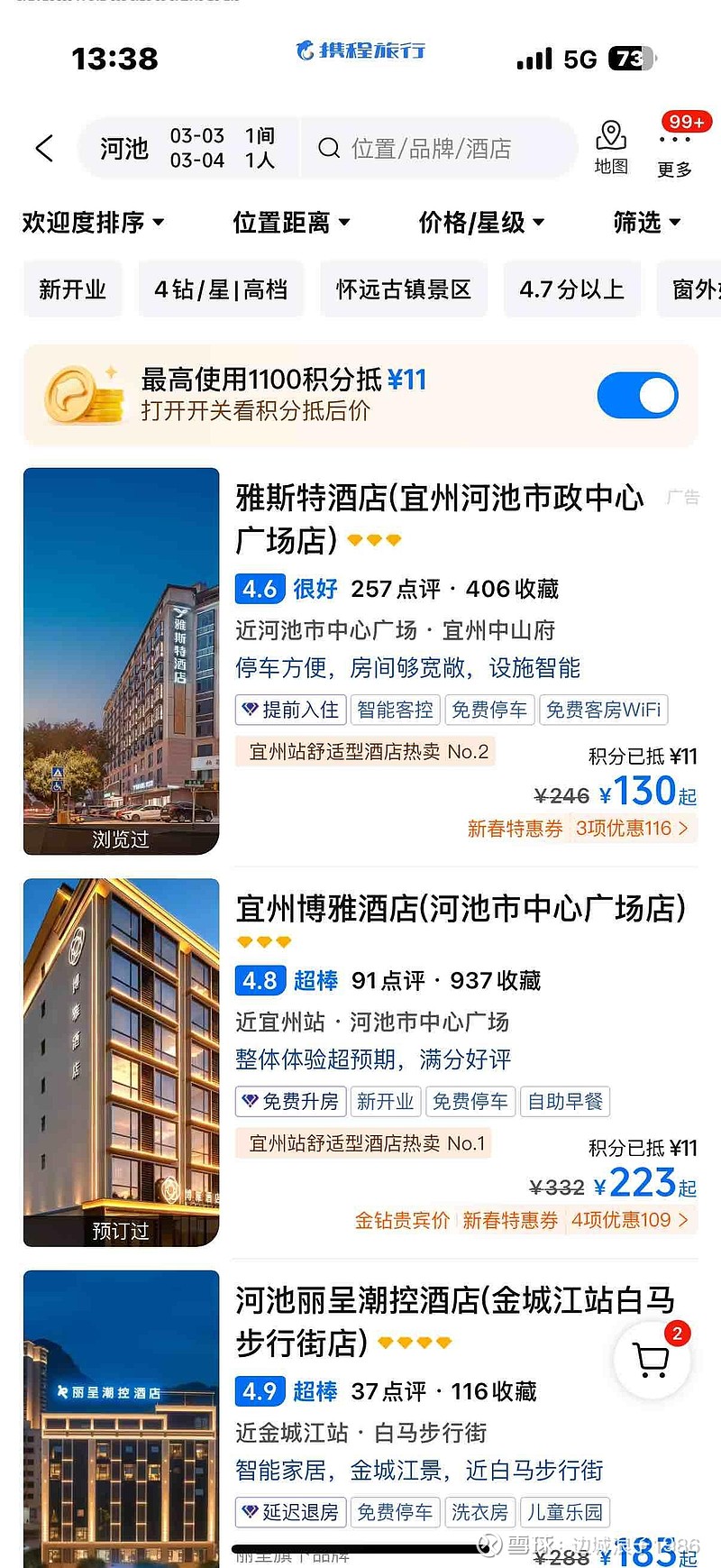 上显示的河池市区的酒店,虽然个人没有体验过,但觉得属于中等舒适酒店,适合学生党