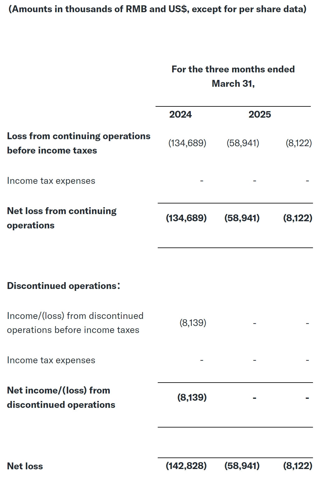Tims天好中国2025年第一季度经调整企业EBITDA为-2930万元,上年同期为-5230万元;持续经营业务净亏损为5890万元,上年同期为净亏损1.347亿元。