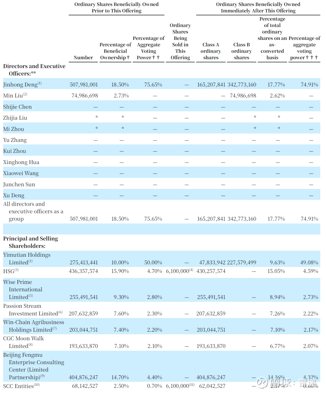 红杉中国持股为15.05%,有4.59%的投票权;Wise Prime International持股为8.94%,有2.73%的投票权;Passion Stream Investment持股为7.26%,有2.22%的投票权;Win-Chain Agribusiness Holdings持股为7.1%,有2.17%的投票权;