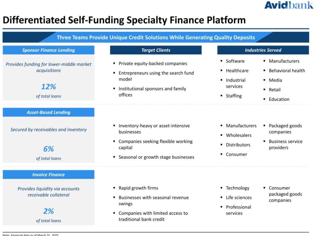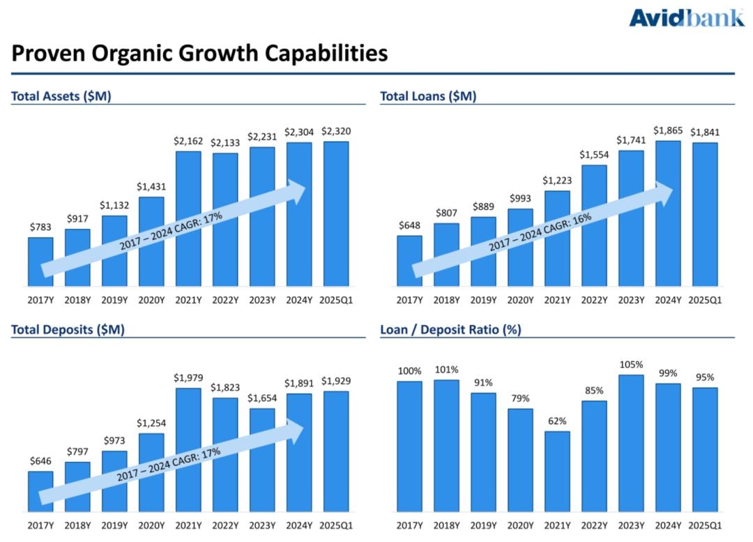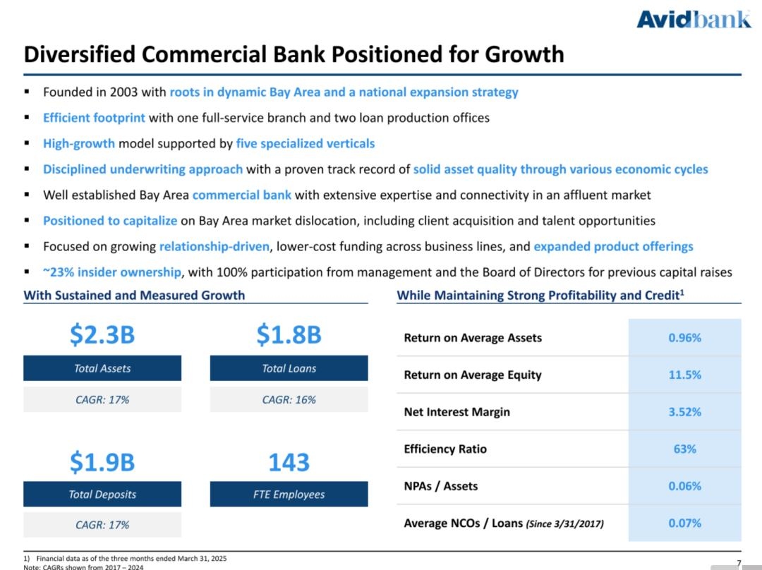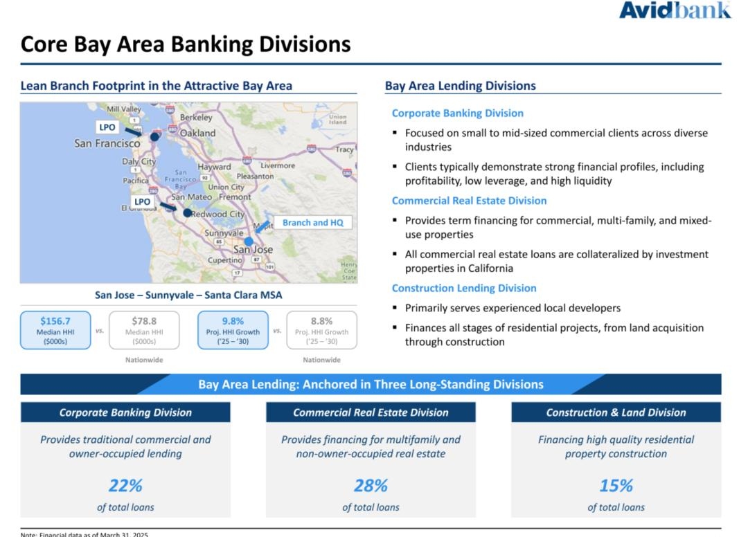 截至2025年3月31日,Avidbank的总资产为22.9亿美元,贷款总额为18亿美元,存款总额为19亿美元,股东权益总额为1.97亿美元。