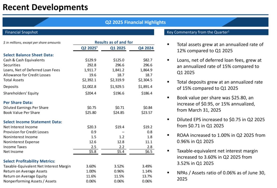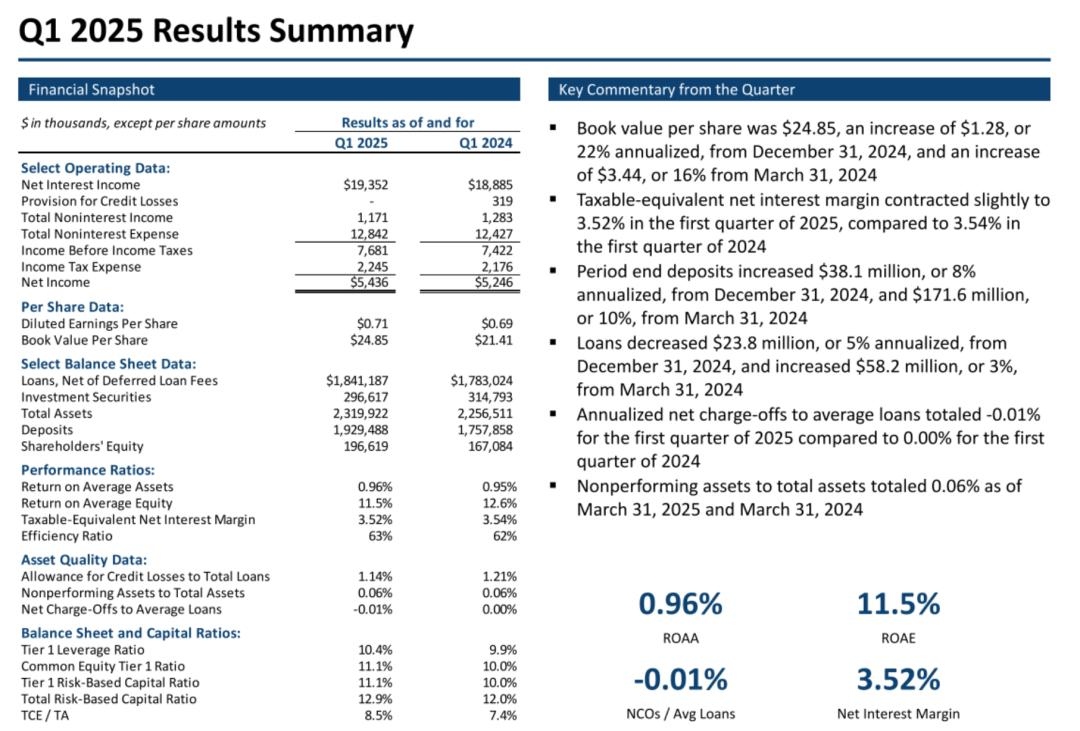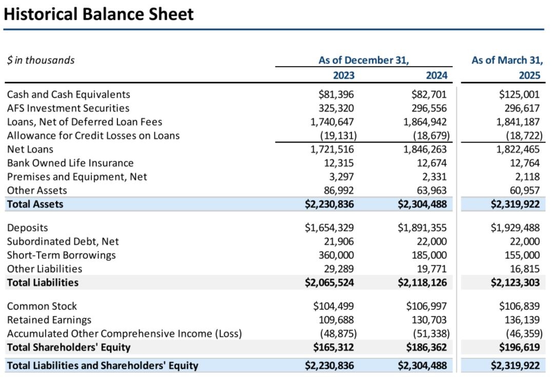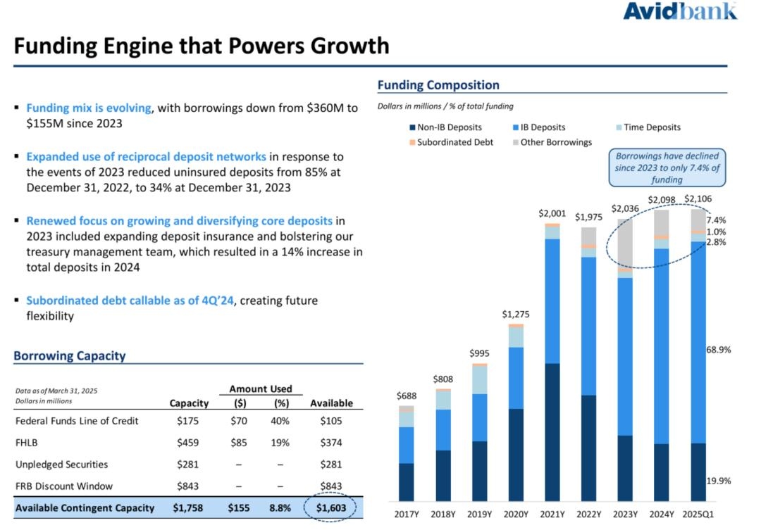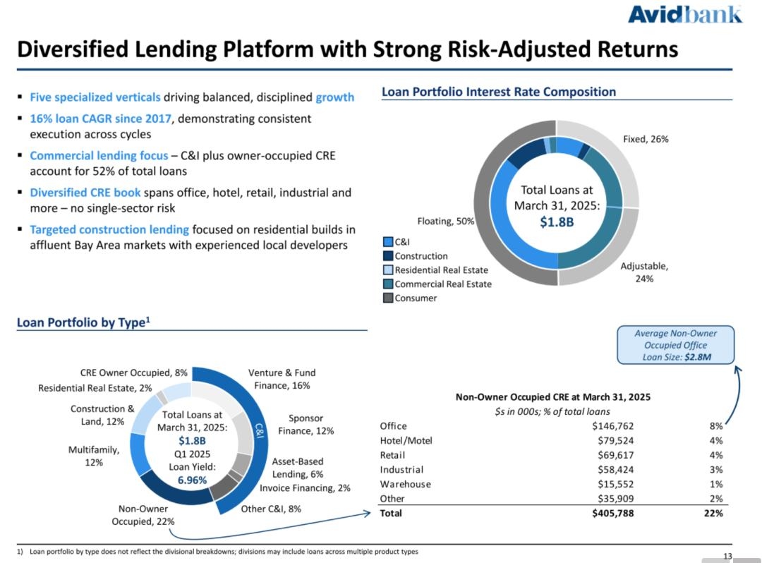 截至2025年3月31日,Avidbank的总资产为22.9亿美元,贷款总额为18亿美元,存款总额为19亿美元,股东权益总额为1.97亿美元。
