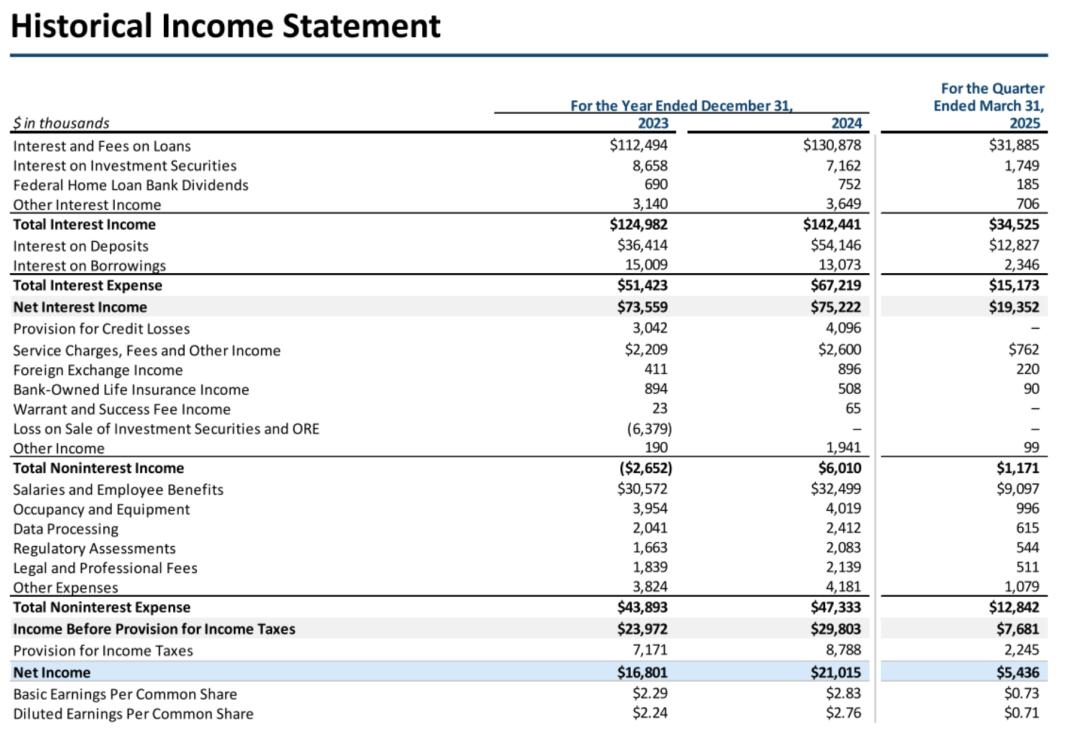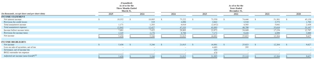 招股书显示,Avidbank在2022年、2023年、2024年净利息收入分别为7444.6万美元、7355.9万美元、7522万美元;2025年第一季度净利息收入为1935万美元。