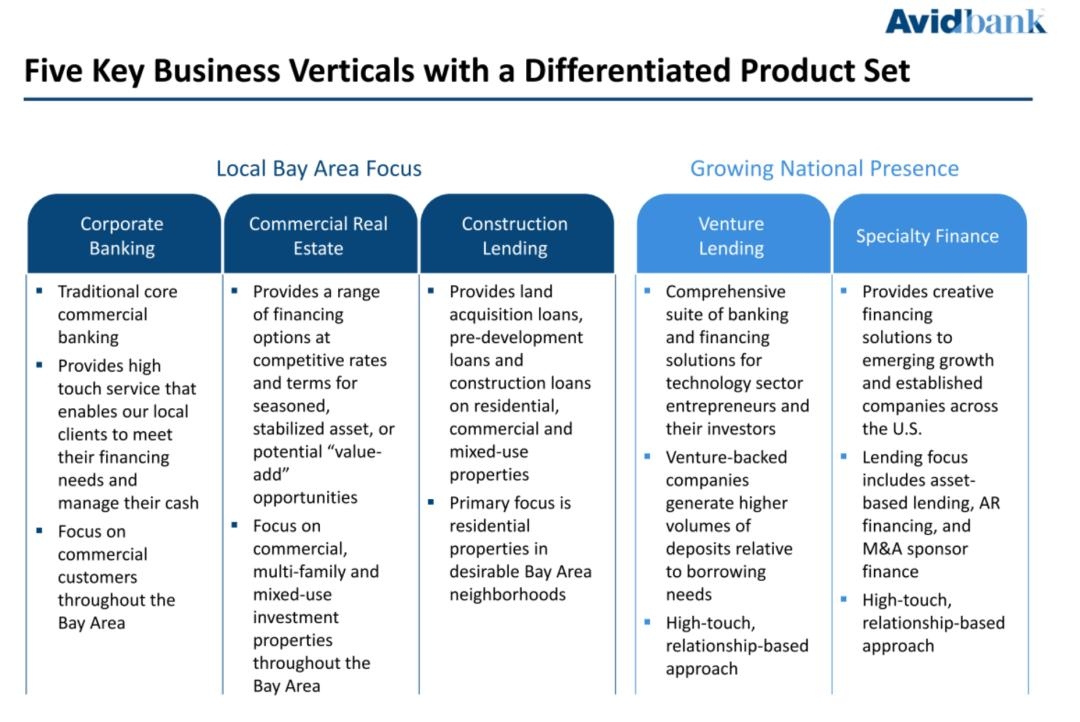 Avidbank专注于湾区的企业银行业务、商业房地产和房地产建设贷款。该银行在加州设有一家分行和两家贷款生产办公室,其专业金融和风险贷款部门的银行家和客户遍布美国37个州。