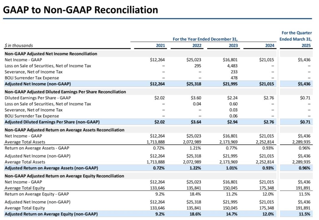 Avidbank在2022年、2023年、2024年净利分别为2502万美元、1680万美元、2102万美元;2025年第一季度净利为543.6万美元。