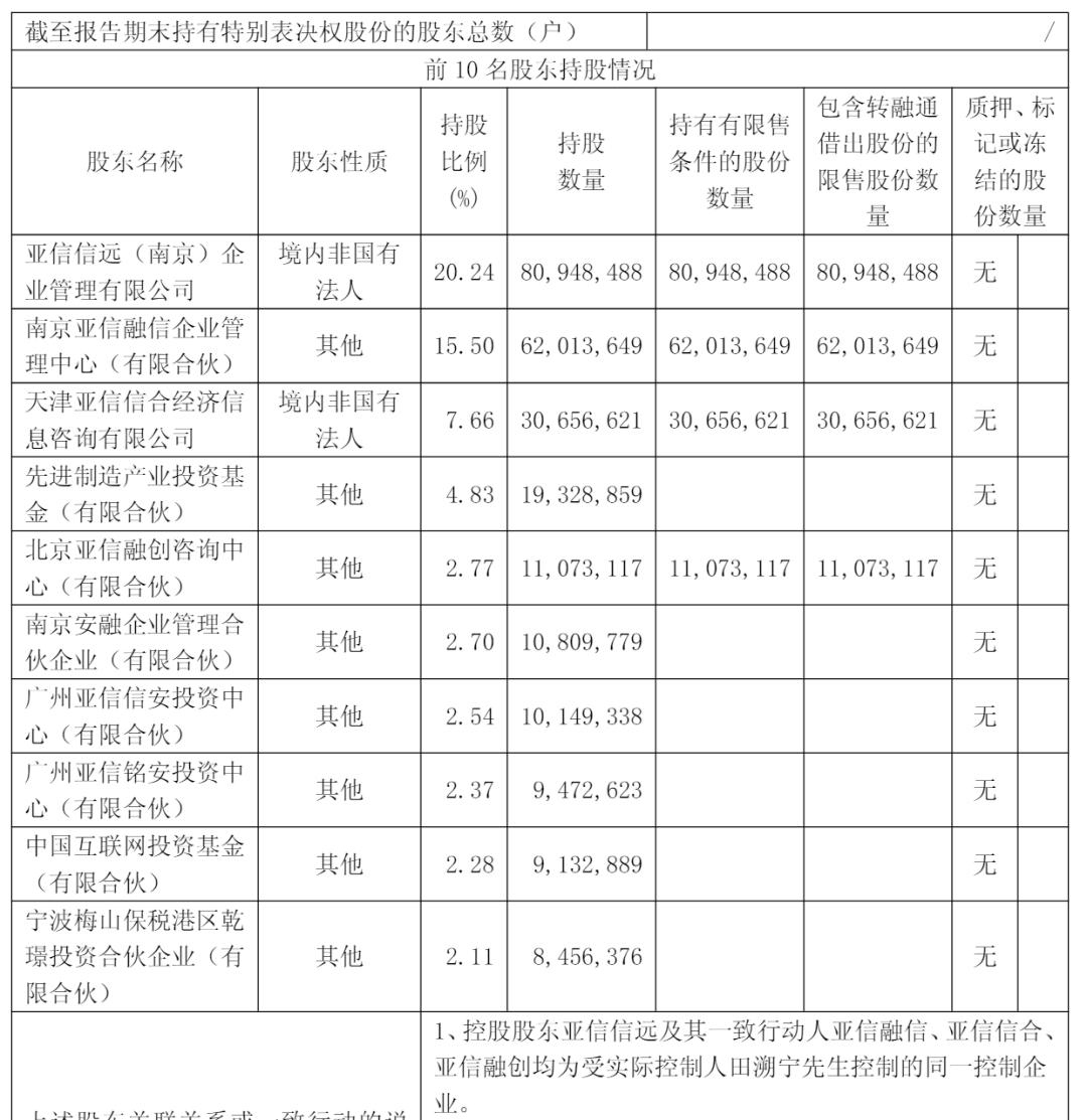 截至2025年6月30日,亚信信远(南京)企业管理有限公司持股为20.24%,南京亚信融信企业管理中心(有限合伙)持股为15.5%,天津亚信信合经济信息咨询有限公司持股为7.66%;