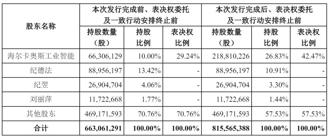 在本次发行完成后、表决权委托及一致行动安排终止后,海尔卡奥斯工业智能控制的表决权比例等于直接持股比例26.83%。