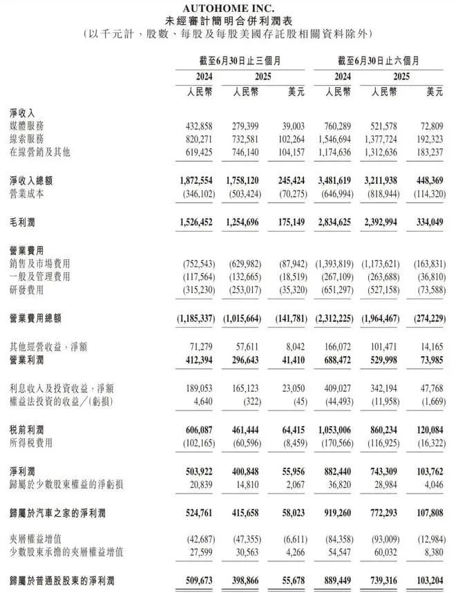 财报显示,汽车之家2025年第二季度营收为17.58亿元(2.45亿美元),较2024年同期的18.73亿元下降6.14%。