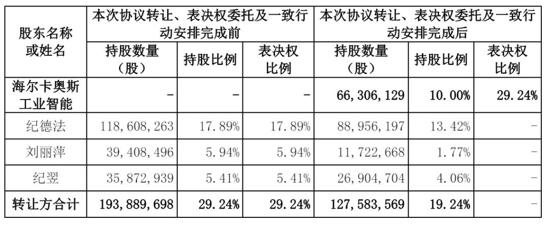 刘丽萍将其持有的上市公司无限售流通股27,685,828股(占上市公司股份总数的4.18%)依法转让给海尔卡奥斯工业智能;纪翌将其持有的上市公司无限售流通股8,968,235股(占上市公司股份总数的1.35%)依法转让给海尔卡奥斯工业智能。