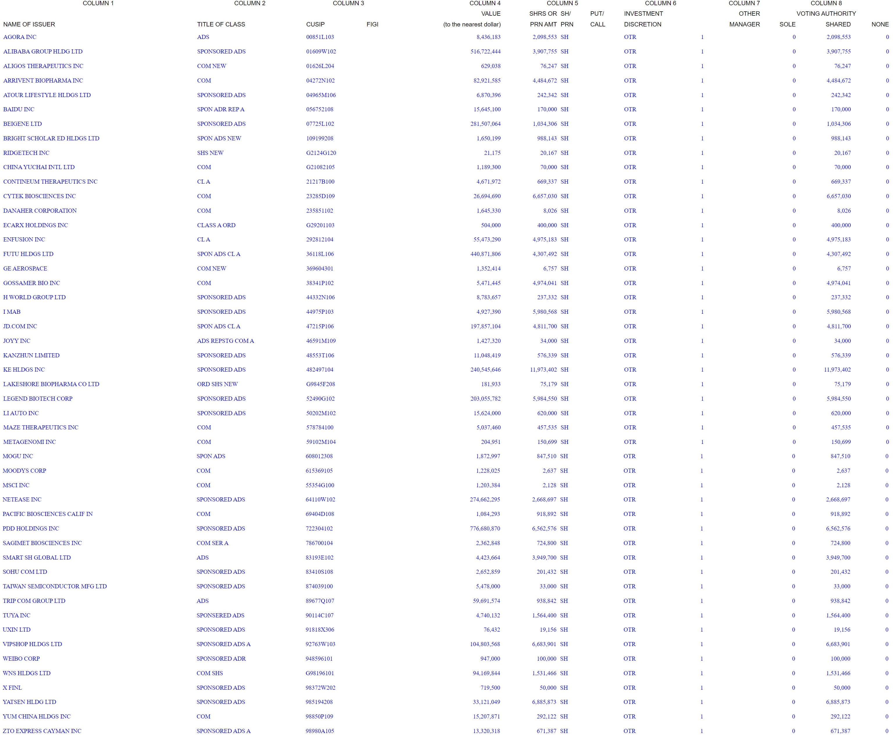 高瓴持有百济神州ADS价值约2.5亿美元,持有阿里巴巴约1.3亿美元,持有传奇生物价值约2.12亿美元。