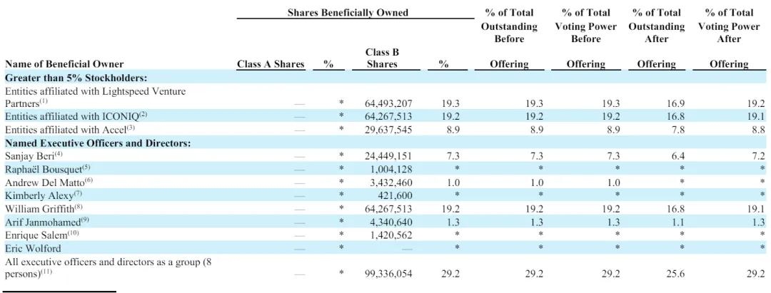 IPO后,Lightspeed Venture持有16.9%的股权,有19.2%的投票权;ICONIQ持有16.8%的股权,有19.1%的投票权;