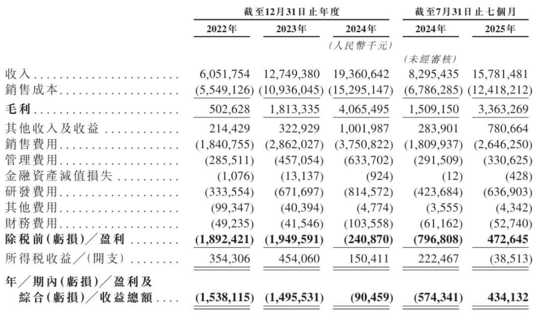 据招股书披露,岚图在销量、营业收入及毛利率等关键指标上均呈现持续跃升态势。于2022年、2023年、2024年及截至2025年7月31日止的7个月期间,岚图汽车分别实现销售19,409辆、50,285辆、80,116辆及66,680辆汽车。
